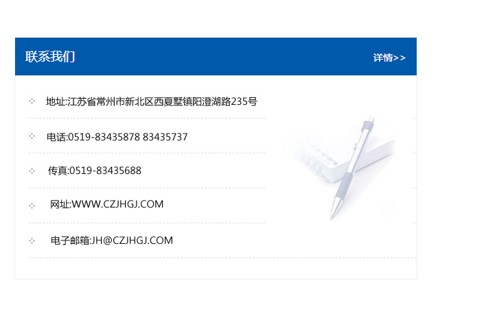 地址:常州市新北區友邦商務大廈1幢16、17層  電話:0519-85101652  傳真:0519-85112595  郵編:213022  網址:www.cz-jiayue_cn.mdjetr.com  郵箱:xiajifengaa@163.com